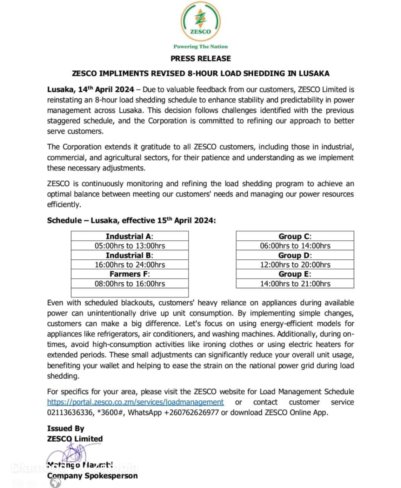 ZESCO Limited says it will revert to the 8-hour loadsheding Schedule in Lusaka as the staggered schedule posed numerous challenges.