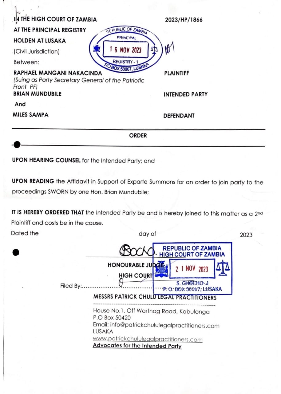 High Court Judge Situmbeko Chocho has granted an application by Mporokoso Member of Parliament and PF Presidential Candidate, Hon. Brian Mundubile to be joined to the Miles Sampa case.